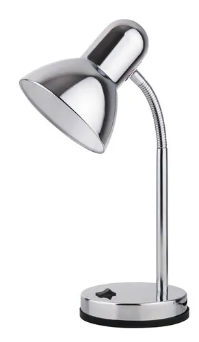 Praktikus íróasztali megvilágítást biztosító, modern stílusú asztali lámpa. 33 cm magas, fémből készített, króm színű lámpatest, pozícionálható lámpabúrával, hálózati vezetékkel és kapcsolóval. A lámpatest max. 40W teljesítményű, E27-es foglalatú, halogén és energiatakarékos fényforrással is használható.