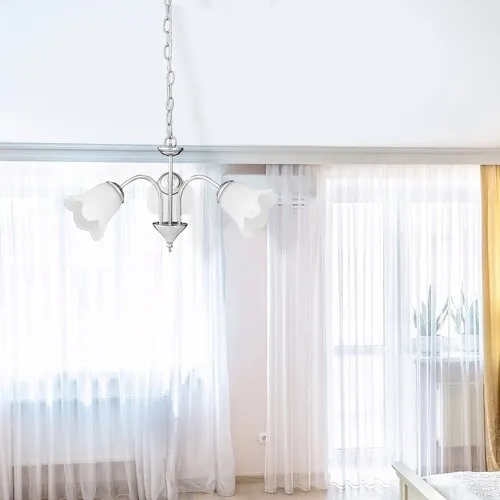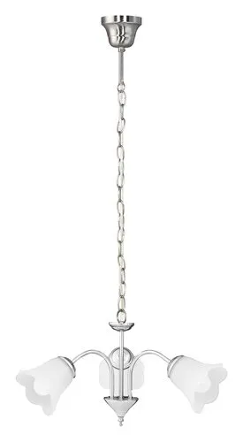 Klasszikus megjelenésű csillár 3 db foglalattal. 90 cm lelógású, 60 cm átmérőjű, króm színű fémből készített lámpatest fehér opálüveg búrákkal. A lámpatest E-14-es foglalatú, max. 3x 40W teljesítményű halogén vagy energiatakarékos fényforrásokkal használható.