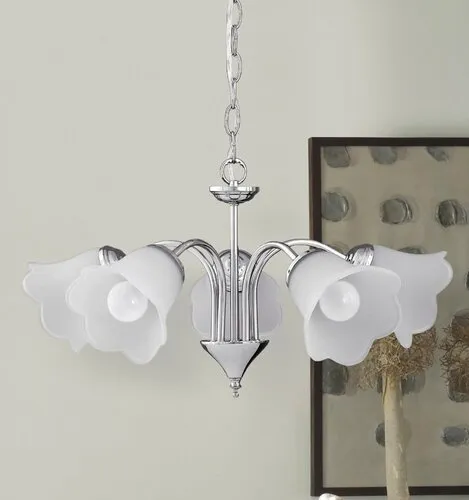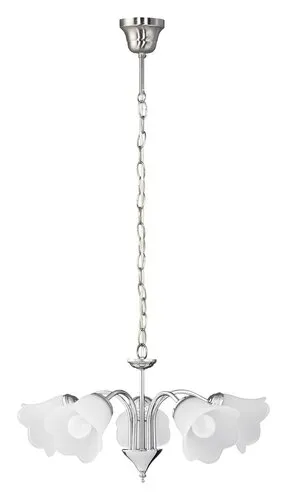 Klasszikus megjelenésű csillár 5 db foglalattal. 90 cm lelógású, 60 cm átmérőjű, króm színű fémből készített lámpatest fehér opálüveg búrákkal. A lámpatest E-14-es foglalatú, max. 5x 40W teljesítményű halogén vagy energiatakarékos fényforrásokkal használható.