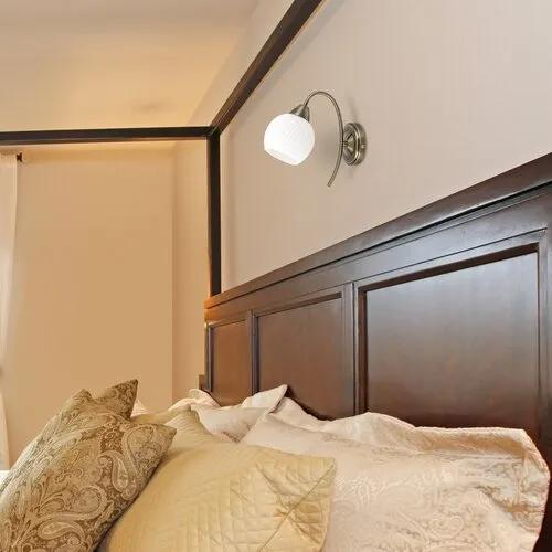Klasszikus megjelenésű fali lámpa 1 db foglalattal. 26 cm kinyúlású, 24 cm magas, antik bronz színű fém lámpatest fehér színű üveg lámpabúrával. A lámpatest E-14-es fogalatkialakítású, max. 40W teljesítményű fényforrással használható.