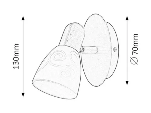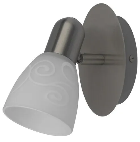 A kortalan stílusú spotlámpa, 1 darab foglalattal. 13 cm magas, szatin króm színű fém szerkezet és pozícionálható, fehér alapszínű, mintás üvegbúra, IP20-as védelemmel. A lámpatest E14-es foglalatú, max. 40W teljesítményű, halogén vagy LED fényforrással is használható.