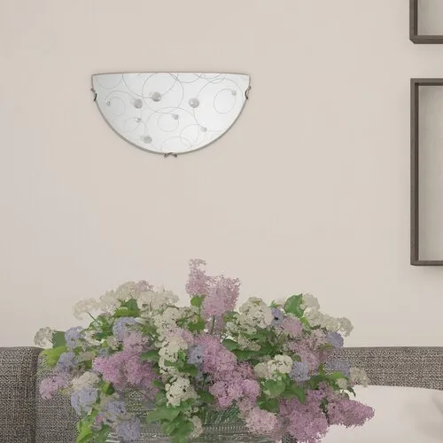 30 cm átmérőjű, hagyományos fali lámpa, fém és műanyag szerkezettel, kiváló minőségű, üveggyöngyözött, fehér alapszínű, inda mintás lámpabúrával. E27-es foglalatú, maximum 60W teljesítményű, halogén vagy LED fényforrással is használható.