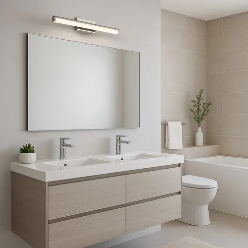 Modern megjelenésű fürdőszobai lámpa állítható fejjel és beépített energiatakarékos LED fényforrással. 48,6 cm széles, króm színű fém lámpatest műanyag lámpabúrával, IP44-es védelemmel, azaz fröccsenő víz és por ellen is védelmet biztosít. A beépített LED fényforrás 12W teljesítmény mellett 1180 lumenes fényerőt és 4000 Kelvines, természetes fehér színű fényt biztosít. 5 év garanciával. A lámpatestben a fényforrás nem cserélhető!