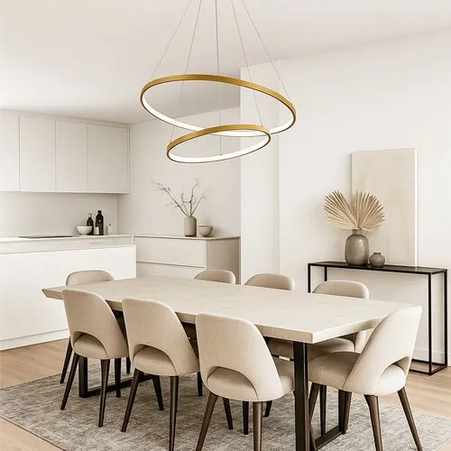 A Rábalux Beliza kettes függőlámpát azoknak ajánljuk, akik a funkcionalitás mellett a kreatív, figyelemfelkeltő dizájnt is nagyra értékelik. A modern függeszték lámpa két gyűrű formájú elemből áll, és arany színben, fémből készül. A két gyűrű eltérő átmérőjű, és egymással szöget zár be. A lámpa a gyűrűk belső részén világít, a búrák anyaga fehér színű szilikon. A függeszték lámpát kerek, arany színű dísztalp és ezüst színű, fém tartókábelek egészítik ki. Beépített LED fényforrást tartalmaz, amely gondoskodik az energiahatékony működésről és a hosszú élettartamról. A fényerő és a színhőmérséklet távirányítóval állítható. Az okos mennyezeti függő lámpa ezenkívül éjszakai funkcióval is rendelkezik. Ideális választás a nappaliba, étkezőbe vagy a hálószobába.