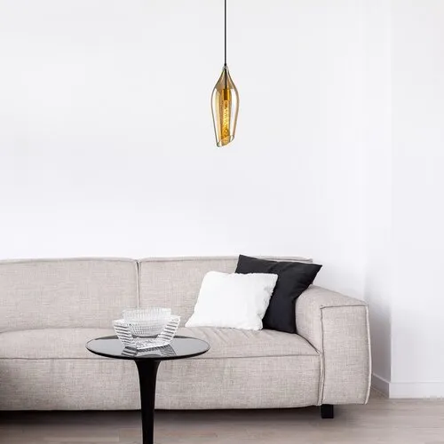 A gyönyörű, légies formatervezésű Bellini egyes függeszték modern nappalink berendezésének stílusos, egyedi darabja lehet. Különösen jó választás azokba a szobákba, amelyekben a fekete és a földszínek dominálnak. A fémből készült fekete lámpát alul nyitott, ferdén elvágott, kecses tulipánra emlékeztető borostyánszínű üvegbúra egészíti ki. A lámpafejet textilkábel köti össze a kisméretű, kerek, fekete dísztalppal. A Bellini egy darab legfeljebb 60 W teljesítményű fényforrással használható, a foglalat típusa E27. Ehhez a szemet gyönyörködtető függesztékhez ízlésünktől és az elérni kívánt hatástól függően választhatunk meleg vagy természetes fehér fényű fényforrást. A lámpa méretei a következők: magassága 400 mm, átmérője 140 mm, belógása 1000 mm, beépítési átmérője 120 mm. A Bellini egyes függesztéket fényforrás nélkül szállítjuk.