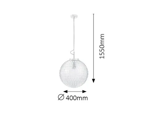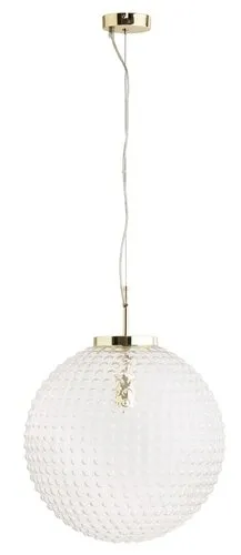 Klasszikus megjelenésű függeszték 1 db foglalattal. 155 cm lelógású, arany színű fém szerkezet és 40 cm átmérőjű, áttetsző üveg lámpabúra. A lámpatest E27-es foglalatkialakítású, max. 60W teljesítményű, energiatakarékos fényforrással is használható.