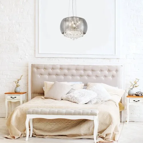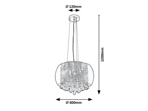 A modern stílus képviselői közé tartozó Ninelle függesztéket azoknak ajánljuk, akik szívesen választanak csillogó, elegáns világítótestet a nappaliba vagy a hálószobába. A fémből készült, krómszínű lámpatestet színezett üvegbúra egészíti ki, amelynek egy részét függönyként takarja a ragyogó üvegkristály dekoráció. A Ninelle olyan, mint egy mennyezetről csüngő, különleges ékszer. A lámpa kisméretű, kerek dísztalp segítségével rögzíthető a mennyezetre. Ez a látványos modell hat darab, egyenként legfeljebb 40 W teljesítményű fényforrással használható, a foglalatok típusa G9. Ízlésünktől és az elérni kívánt hatástól függően választhatunk hozzá meleg vagy természetes fehér fényű fényforrásokat. A Ninelle függeszték méretei a következők: átmérője 400 mm, belógása 1400 mm, beépítési átmérője 120 mm. Ezt a modellt fényforrások nélkül szállítjuk.