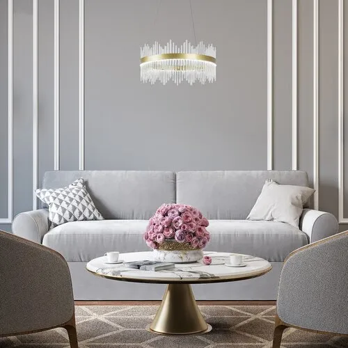 A klasszikus stílusú Mabel okos függeszték látványos világítási megoldást kínál a nappaliba vagy a hálószobába. Elsősorban azoknak ajánljuk, akik kedvelik a díszesebb, feltűnőbb mennyezeti lámpákat, és nagy fényerejű modellt keresnek. A fémből készült, aranyszínű lámpát átlátszó üvegbúra egészíti ki, és kerek dísztalp segítségével rögzíthető a mennyezetre. A csillogó függesztéket egy aranyszínű, gyűrű formájú elem, és az ebből fel- és lefelé kinyúló, csillogó jégcsapokra emlékeztető, hengeres elemek alkotják. A Mabel a G energiaosztályba tartozó beépített LED fényforrással rendelkezik, amelynek teljesítménye 36 W, fényereje búrával 2480 lumen, búra nélkül 2700 lumen, élettartama pedig 36 000 óra. A fényforrás színhőmérséklete fali kapcsoló segítségével változtatható: 3000, 4000 vagy 6000 K-t, azaz meleg, természetes vagy hideg fehér fényt állíthatunk be. Az okos függő lámpa méretei a következők: átmérője 580 mm, beépítési átmérője 200 mm, belógása 500–1000 mm között állítható.