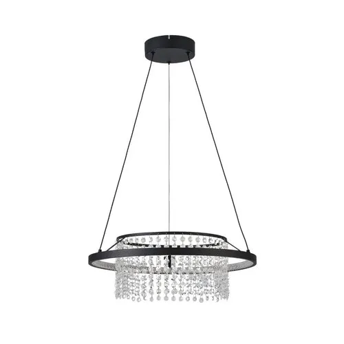 A Rábalux Maribell mennyezeti függőlámpát azoknak ajánljuk, akik az energiahatékonyság mellett a látványos designról sem szeretnének lemondani. Ez az elegáns okos függeszték lámpa tökéletes választás modern nappalikba, étkezőkbe vagy hálószobákba. A lámpatest kerek, és fekete színben, fémből készül. Átlátszó üvegkristály búra és kisméretű, kerek dísztalp egészíti ki. A búra a lámpatest belső peremén fut körbe, míg a lámpa közepéről kristályfüzérek fürtje csüng lefelé. A szemet gyönyörködtető függesztett lámpa beépített LED fényforrást tartalmaz, amelynek színhőmérséklete DIP-kapcsolóval háromféle változatban állítható: meleg vagy természetes fehér fényt választhatunk. A lámpa jelentős fényerővel bír, ugyanakkor a LED technológia révén energiahatékonyság és hosszú élettartam jellemzi.