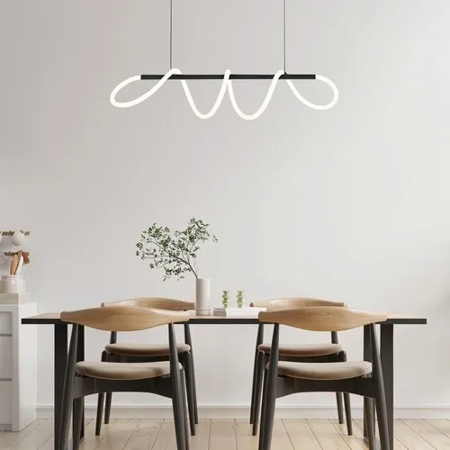 A modern stílusú Montema függeszték egyedi megjelenésével és nagy fényerejével remek választás lehet a nappaliba, az étkezőbe vagy hálószobába. Ezt a modellt elsősorban azoknak ajánljuk, akik kedvelik a meglepő és kreatív formavilágú lámpákat. A fémből, fekete színben, fehér szilikonbúrával készült Montema a tartókábelekre függesztett vízszintes rúdból, és az azon végigkanyargó világító lámpaelemből áll. A függő lámpa kisméretű, kerek dísztalp segítségével rögzíthető a mennyezetre, és az F energiaosztályba tartozó beépített LED fényforrással rendelkezik. Ennek teljesítménye 40 W, fényereje búrával 3750 lumen, búra nélkül 4000 lumen, élettartama pedig 20 000 óra. A 4000 K színhőmérsékletű fényforrás természetes fehér fénnyel világít, amely modern, tiszta hatást eredményez, és ideális otthonunk nagy forgalmú helyiségeiben. A Montema lámpa méretei a következők: szélessége 1020 mm, belógása 1200 mm, beépítési átmérője 160 mm.