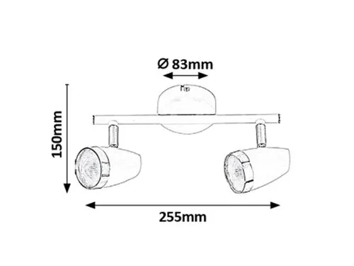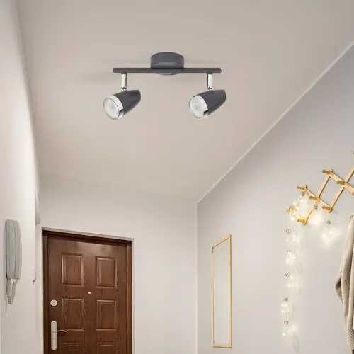 Modern megjelenésű spotlámpa, 2 db beépített, energiatakarékos LED fényforrással. 25,5 cm széles, antracit szürke és króm színű, fémből és műanyagból készített lámpatest pozícionálható lámpabúrákkal. A beépített LED-es lámpa teljesítménye 2x4 W, melyhez 2x280 lumen fényerő társul. Színhőmérséklete melegfehér (3000 Kelvin). 5 év garanciával. A lámpatestben elhelyezett fényforrások nem cserélhetők.