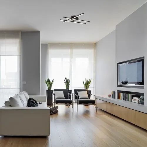 A Svetlana mennyezeti lámpát azoknak ajánljuk, akik a megszokottól merőben eltérő formavilágú világítótestet keresnek modern nappalijukba, hálószobájukba vagy dolgozószobájukba. A Svetlana matt fekete, alumínium lámpatestből és fehér műanyag búrákból áll. A kerek, fekete dísztalphoz kapcsolódó lámpatestet három hosszú, pálcikaszerű elem alkotja, amelyek közös metszete háromszöget formáz. A lámpatest elemei tetszés szerint elforgathatók. A lámpa beépített LED fényforrással rendelkezik, amelynek teljesítménye 25 W, fényereje 950 lumen, élettartama pedig 15 000 óra. A meleg fehér fénnyel világító fényforrás színhőmérséklete 3000 K. A mennyezeti lámpa méretei a következők: szélessége 500 mm, átmérője 535 mm, mennyezettől mért távolsága 85 mm, beépítési átmérője 130 mm. Erre az extravagáns modellre 5 év garanciát vállalunk.