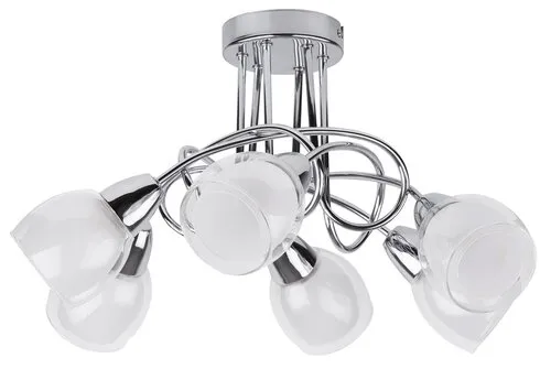 Modern megjelenésű mennyezeti lámpa 6 db foglalattal. 41 cm átmérőjű, króm színű fém lámpatest valamint fehér és áttetsző színkombinációjú üveg lámpabúrák. A lámpatest E-14-es foglalatú, max. 6x 40W teljesítményű energiatakarékos fényforrásokkal is használható.
