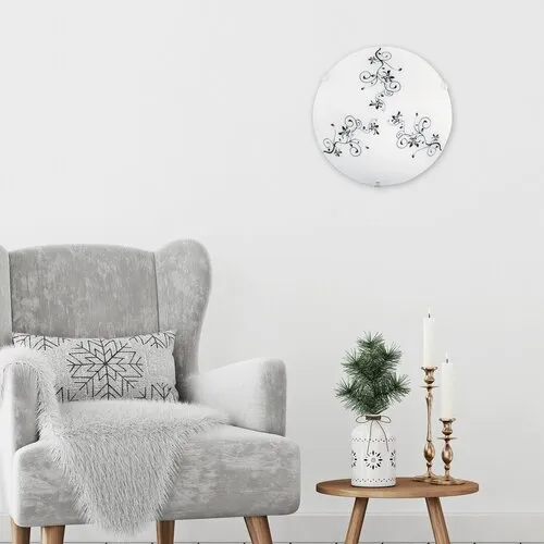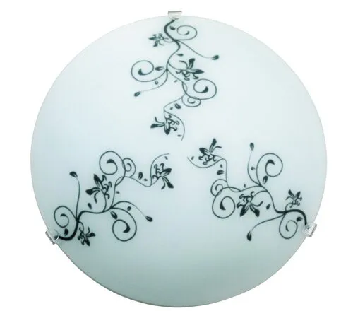 25 cm átmérőjű, romantikus megjelenésű mennyezeti lámpa. Fém és műanyag szerkezetű, fehér üveg lámpabúrával, fekete virágmintával. E27-es foglalatú, maximum 60W teljesítményű, halogén vagy LED fényforrással is használható.