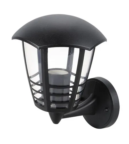 Klasszikus megjelenésű, felfelé irányított búrával ellátott kültéri fali lámpa 1 db foglalattal, UV sugárzásnak ellenálló kivitelben. 23 cm magas, 19,3 cm a faltól mért távolsága, fekete színű fém lámpatest és víztiszta műanyag betétes lámpabúra, IP44-es, azaz fröccsenő víz és por elleni védelemmel. A lámpatest E27-es foglalatú, max. 60W teljesítményű fényforrással használható.
