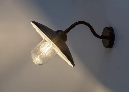 Időtlen megjelenésű kültéri fali lámpa 1 db foglalattal. 40 cm magas, 40 cm a faltól mért távolsága, matt fekete és fehér színű fémből készített lámpatest víztiszta üveg lámpabúrával, IP44-es, azaz fröccsenő víz és por elleni védelemmel. A falikar E27-es foglalatú, max. 60W teljesítményű energiatakarékos fényforrással is használható.