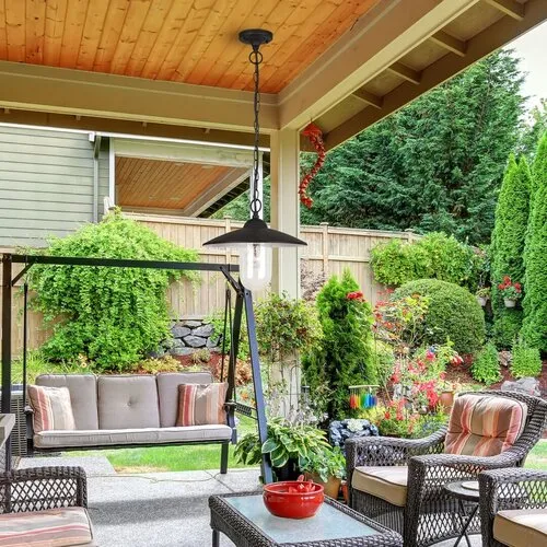 Időtlen megjelenésű kültéri függeszték 1 db foglalattal. 83 cm lelógású, 30 cm ernyőátmérőjű, matt fekete és fehér színű fémből készített lámpatest víztiszta üveg lámpabúrával, IP44-es, azaz fröccsenő víz és por elleni védelemmel. A függeszték E27-es foglalatú, max. 60W teljesítményű energiatakarékos fényforrással is használható.