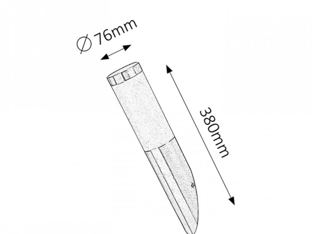 Modern megjelenésű kültéri falikar UV sugárzásnak ellenálló kivitelben. 38 cm magas, 7,6 cm átmérőjű, döntött talapzatú, rozsdamentes acél színű fém lámpatest és fehér színű műanyag lámpabúra, IP44-es, azaz fröccsenő víz és por elleni védelemmel. A lámpatest E27-es foglalatú, max. 25W teljesítményű energiatakarékos fényforrással is használható.